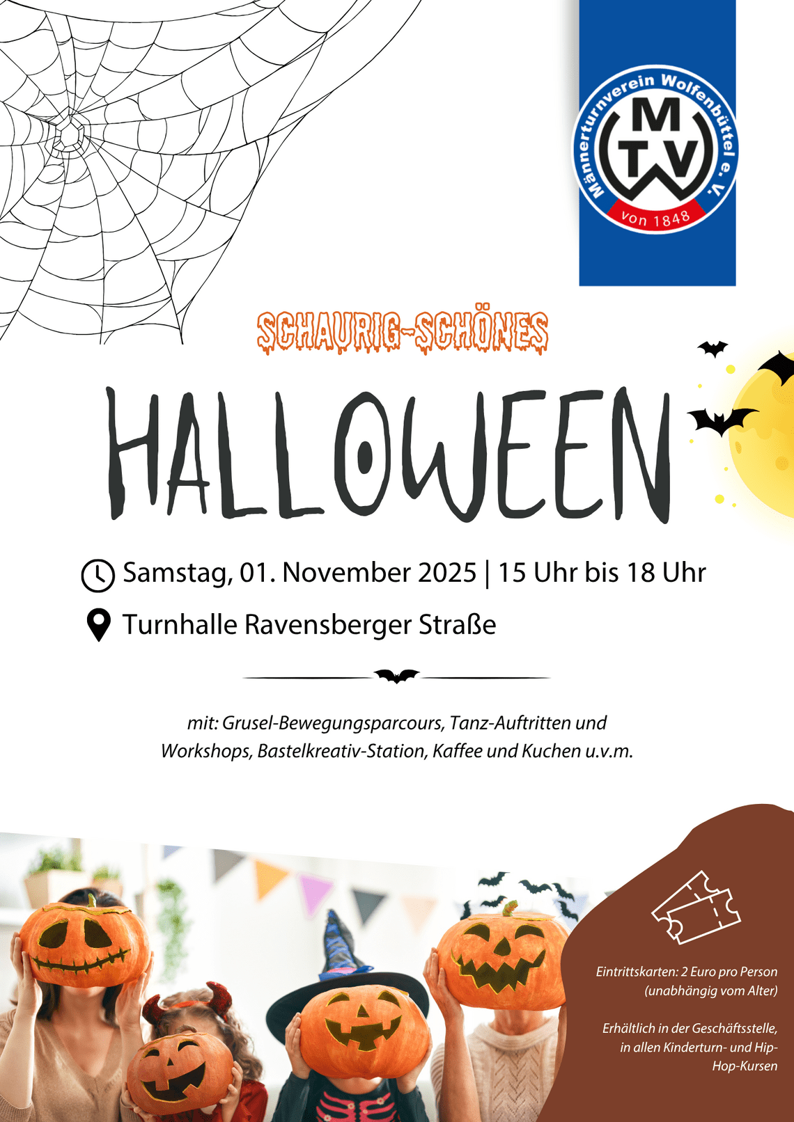 Von 15 bis 18 Uhr dürfen die Familien sich über einen Grusel-Bewegungsparcours, Tanz-Auftritte, Workshops, Bastelstationen und vieles mehr freuen. Kira Bock organisiert die Veranstaltung gemeinsam mit Eva Groß, Hip-Hop-Leitung des Vereins, und freut sich auf viele Geister und Hexen. Der Eintritt kostet 2 Euro und die Karten sind ab sofort in unserer Geschäftsstelle, sowie in den Kinderturn- und Hip-Hop-Stunden erhältlich. Ein bisschen Kleingeld darf mitgebracht werden, denn es werden kleine Spenden-Geister unterwegs sein, die gerne ein paar Euros einsammeln um auch zukünftig solche Spiel, Spaß und Bewegungs-Events anbieten zu können.